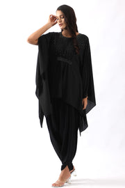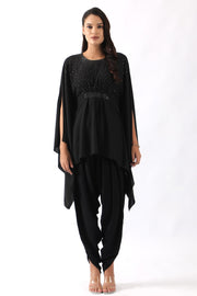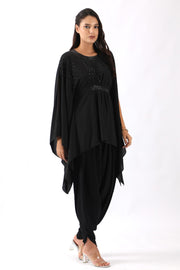 Black embroidered kaftan with belt paired with dhoti