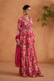 Deepika Chadha's stunning Fuchsia chiffon printed fabric peplum kurti beautifully adorned with sequins, cutdana crystals embroidery. The flowy fuchsia chiffon printed fabric garara adds a touch of sophistication to your look. it is paired with soft net dupatta which keeps you comfortable all day long and is perfect for wedding and festive season.