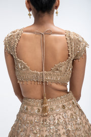 CHAMPANGE GOLD LEHENGA EMBELLISHED WITH SCALLOP DETAILING ALONG EMBROIDERED BLOUSE AND DUPATTA