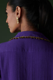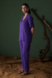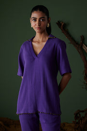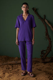 Our Kool Khatta Co-ord, dyed in a juicy jamun hue, features a breezy V-neck shirt with a tassel-detailed collar and straight-fit pants—because lounging in style should be both Khatta and Cool