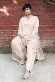 Peach bud short kurta embellished with white and gold embroidery on cuffs and slit area to give it an elegant look. Paired with Afghani salwar enhance with white and gold embroidery on bottom. Paired with organza dupatta with white and gold embroidery and scattered with pearls and sequence.