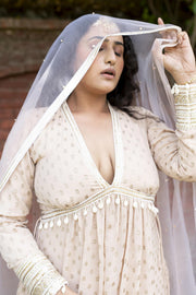 Broad V-neck suit embellished with white and gold embroidery on neckline, waistline and cuffs. Styled with pearls and shells to give it a glamorous look. It is paired with palazzo pants embellished with white and gold embroidery on bottom. And organza dupatta enhance with white and gold embroidery to give it an elegant look.