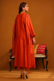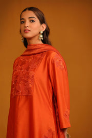 Featuring our Orange Kurta set with fine embroidery combined with delicate applique patch work around the neck and bootas spread all over the Kurta. The A-Line flowy silhouette ensures comfort and ease paired with matching trousers and accessorized with a beautiful Tonal Crushed Silk & Organza Dupatta with hangings.