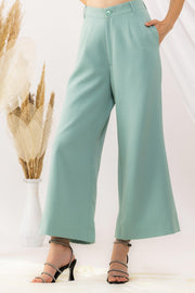 Featuring sea green flared trouser with front button and zip in banana crepe.