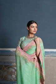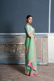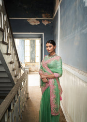 Tara -jade green raw silk embroidered saree with blouse