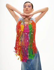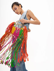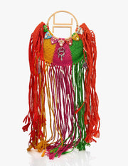 An eccentric energy resides at the House as we introduce The Holiday Eclipse Bag. To craft the statement, a vegan leather moon bag is overlaid with knotted raffia strands and free-falling keshi pearls. Displaying five vibrant hues, the handheld expresses free-spiritedness and is completed with enamelled Gavi faces along it's curved closure. Iconism is added to the Spring/ Summer 2023 with a new metallic handle and dripping central monogram.