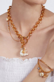 Handcrafted in a gleaming 22K gold finish, the Universe of Charms Bracelet is a medley of a luscious baroque pearl and motifs of celestial worlds. The bracelet can be personalised with your initials or a loved ones, making it a universe, truly yours.