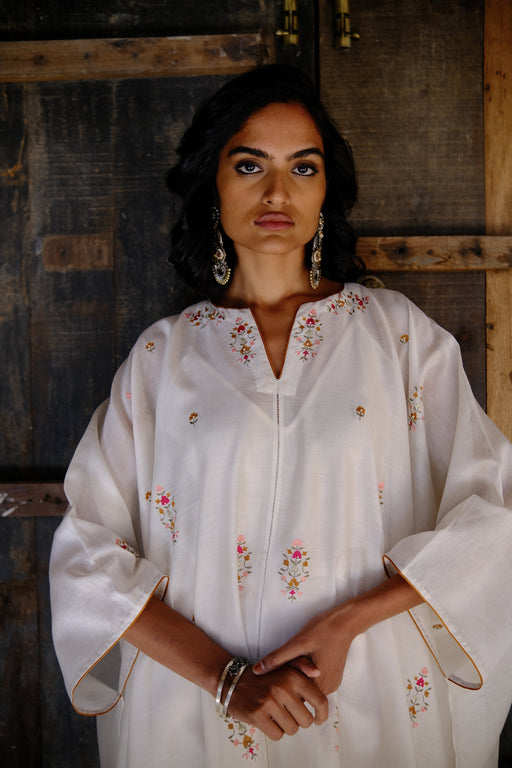 View full detailsIvory thread embroidered KaftAan Paired with Ivory cigaratte pants and separate cotton slip Fabric : Kaftan - Silk chanderi, Pants - Cotton sil...
