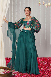 Green Lehenga set with solid skirt in silk organza and print blouse in cotton silk with printed balloon sleeves in silk organza fabric and drape organza dupatta With mulmul lining shell and silk trim