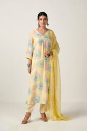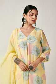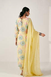 Light yellow floral kurta with inverted box pleat detail and stripe pants in cotton silk fabric. Cotton lace detail in the sleeves