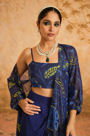 Discover effortless elegance with our blue cape set This chic ensemble features a printed cape with coordnate noodle strappy top in lurex geogette, paired solid drape skirt, The lurex georgette cape adds a touch of glamour and sophistication. Perfect for making a stylish statement at any event.