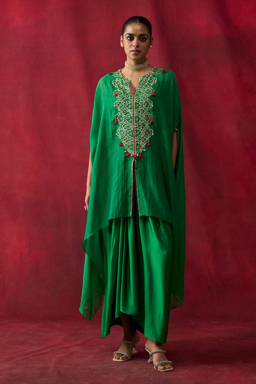 View full detailsGreen Thin Chanderi Thread And Hand Embroiderd Cape With Tassel Details Styled With Silk Satin Draped Skirt Comes With Short Cotton Slip Fabric : C...