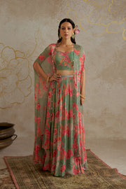 Featuring a sage green printed lehenga in georgette. It is paired with an intricately embroidered blouse and cape in georgette.