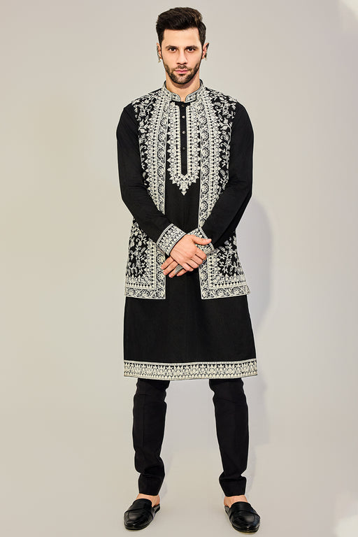 Black Kurta Jacket Set With White Embriodired