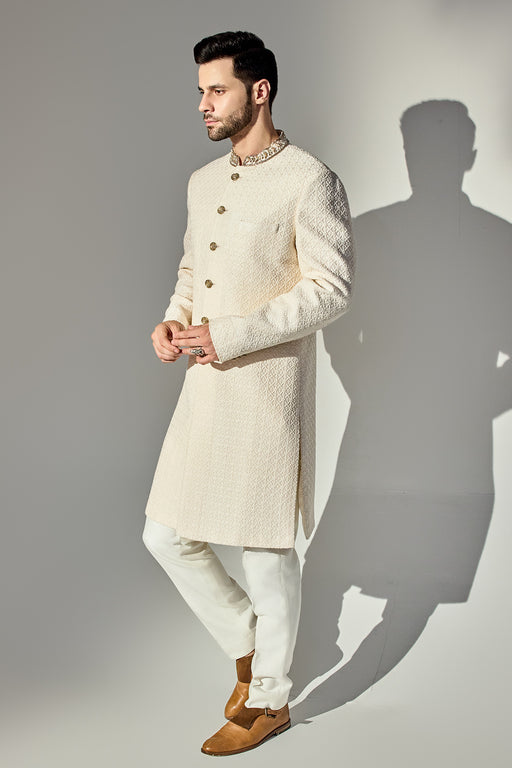 Offwhite Thread Work Achkan With Single Sequins