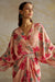 Featuring beige printed draped dress with kaftan style sleeves. It has an embroidered patch on the waist.