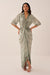 Featuring an ice green printed shirt dress with elbow-length sleeves and an attached belt.