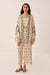 Featuring an ivory printed three-piece co-ord set with a flowy kimono-style cape, a bustier, and relaxed straight-leg pants.