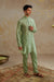 Featuring a sage green chanderi kurta with chinese collar and tucks detailing at front and over sleeves. It is paired with pants
