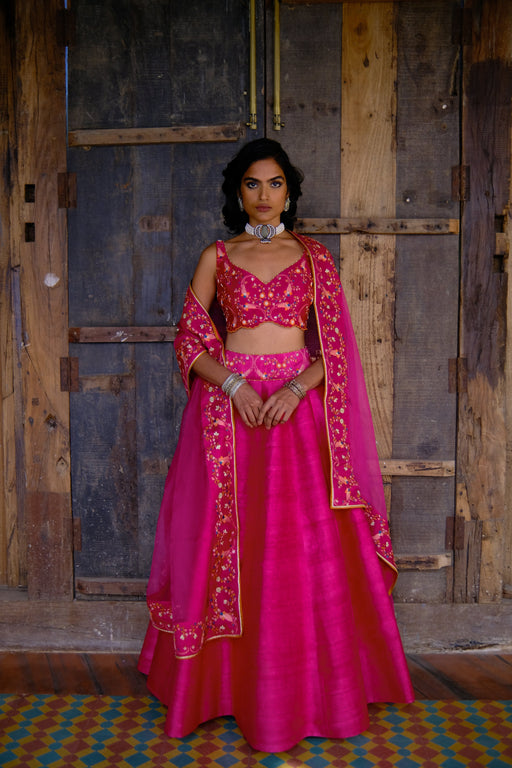 View full detailsFuchsia multi colored thread embroidered sleeveless blouse Paired with Fuchsia embroidered dupatta and Raw Silk Lehenga Fabric : Blouse - Silk ch...