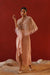 Kapda Dori's stunning blush pink ready to wear armani satin Dhoti set. The blush pink color adds a touch of glamour and sophistication to your look, while the soft fabric ensures you feel comfortable all day or night long. It is styled with a blush pink net corset blouse beautifully adorned with intricate sequins, pearls, cutdana and stone work and net cape fully embroidered with stones, pearls and sequins, finished with feather details.