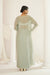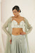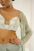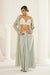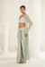 Kapda Dori's stunning Sage green armani satin fabric dhoti features flowy look. The sage green color adds a touch of glamour and sophistication to your look, while the fabric texture ensures you feel comfortable all day or night long. It is styled with a sage green satin blouse adorned with hand embroidery with pearls, crystals, sequens, cutdana and long organza jacket with pearl details to complete the look.