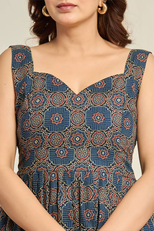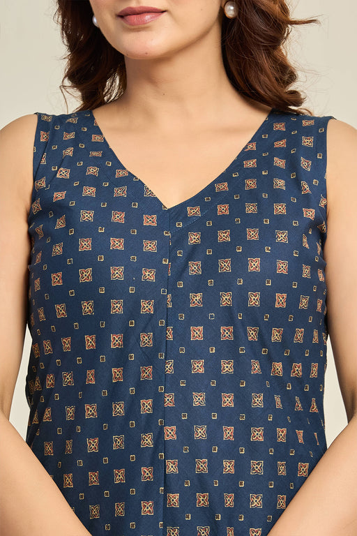 View full detailsTwirl in style with this navy blue sleeveless printed fit and flare dress. Crafted in breathable cotton for timeless charm and everyday elegance. ...