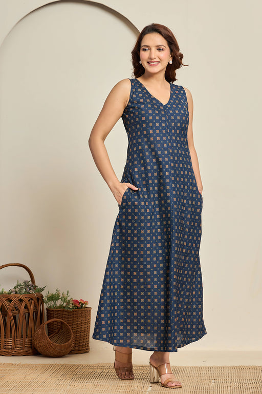 View full detailsElevate your everyday style with this indigo blue sleeveless maxi dress crafted in soft, breathable cotton. Adorned with traditional hand block pri...