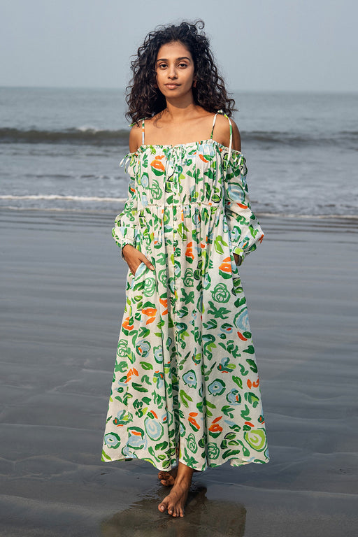 View full detailsThe Roosh dress is made from our cotton linen fabrication in our hand painted floral print. It has smocking detailing on the upper body with gather...