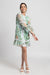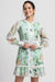 The Aurora Garden Mini Dress By Julo Designs Features Long Cuffed Sleeves, A Round Neck, And A Semifitted Silhouette In Soft, Lightweight Fabric With A Green Base And Vibrant Abstract Patterns.
