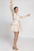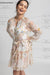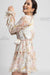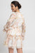 The Creamsicle Flare Mini Dress By Julo Features A Mandarin Collar, Frilled Long Sleeves, And A Cream Base With Peach-Green Patterns. Soft Fabric Makes It Perfect For A Stylish Day Out.