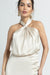 The Creamy Elegance Halter Maxi Dress By Julo Designs Features Luxurious Satin, An A-Line Silhouette, And Cross-Halter Neckline, Offering A Glamorous, Figure-Flattering Fit For Any Special Occasion.