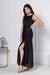 The Noir Glitz Graceful Maxi Dress By Julo Designs Features A Boat Neck, Side Slit, And Cowl Back. Made From Luxurious Black Fabric With Subtle Sparkles, It Blends Elegance And Drama Seamlessly.