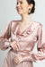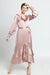 Introducing The Sumptuous Rose Gold Ruffle V Midi Dress By Julo Designs. With A Ruffle V-Neckline, Long Cuffed Sleeves, And A Semifitted Silhouette In Satin, It’S A Perfect Choice For Any Occasion.