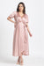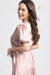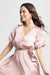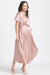 Julo Designs' Rose Gold Surplice Midi Dress Stuns With Puffed Sleeves, A Surplice Neckline, Ribbon Tie-Ups & Luxe Satin—Perfect For Upscale Occasions With Opulence & Style.