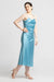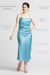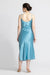 Turquoise Blue Cowl Midi Dress By Julo Designs: Crafted In Satin, Featuring A Cowl Neck, Sleeveless Design, And Fitted Silhouette. The Turquoise Hue And Sleek Style Exude Timeless Elegance And Charm.