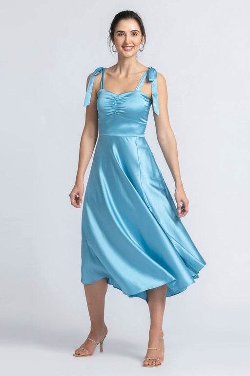 Turquoise Blue Sweetheart Midi Dress By Julo Designs: Satin Fabric, Sweetheart Neckline, Sleeveless Design, And Tie-Up Closures. The Vibrant Turquo...