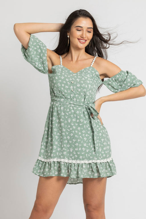 View full detailsEmbrace Timeless Charm With Julo’S Tranquil Garden Mini Dress—Pastel Green, Lace Straps, Sweetheart Neckline, Vintage Buttons & White Floral Mo...