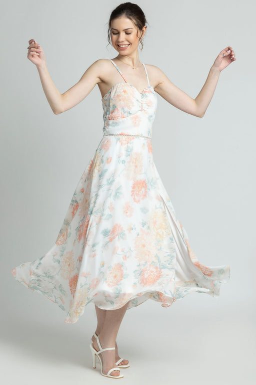 View full detailsUnveil Your Charm With The Exquisite Ivory Sweetheart Midi Dress By Julo Designs. Featuring An Abstract Peach And Green Pattern On A White Base, An...