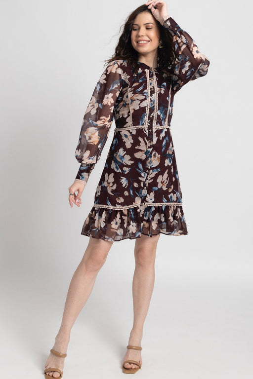 View full detailsMake A Statement In The Russet Bloom Mini Dress By Julo Designs. Featuring A Brown Base With Abstract Peach And Blue Patterns, Cuffed Long Sleeves,...