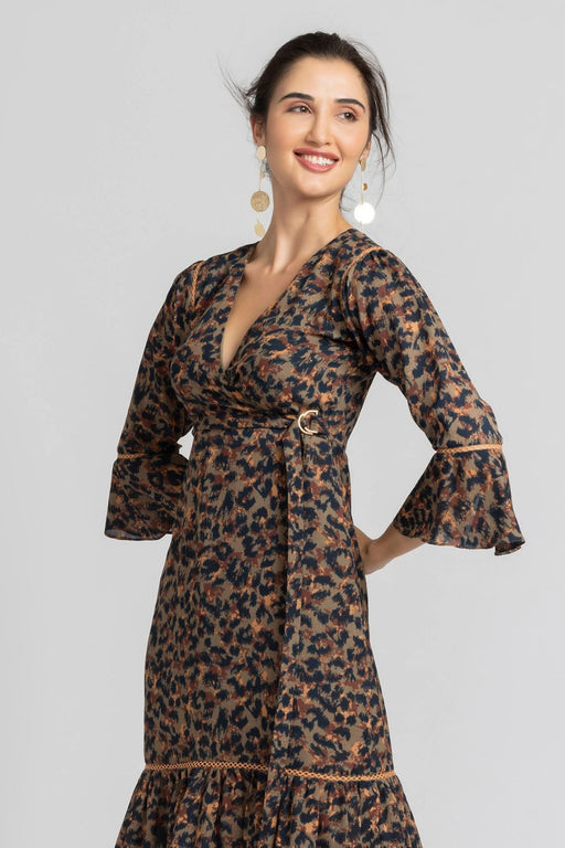 View full detailsUnveil Sophistication With Julo'S Mangrove Adventure Midi Dress. Ruffled Sleeves, Surplice Neckline, Leopard-Inspired Brush Strokes, Semifitted Sil...