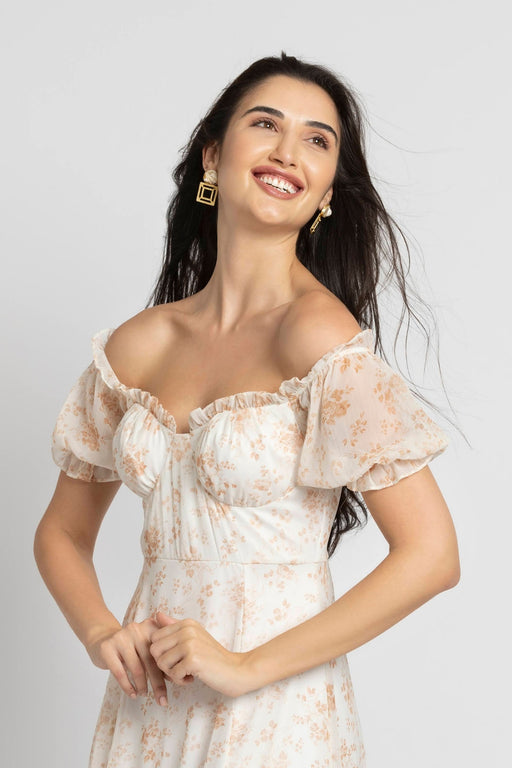 View full detailsEnvelop Yourself In Sophistication With Julo'S Moonlit Romance Off-Shoulder Dress. Snug Off-Shoulder Design, Fit-And-Flare Silhouette, And White Fl...