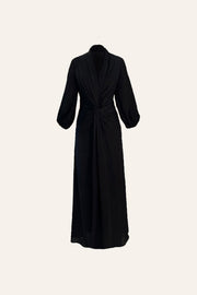 "Features a twisted drape under the bust for a flattering silhouette, fitted at the waist, with 3/4th balloon sleeves adding a touch of drama and sophistication.