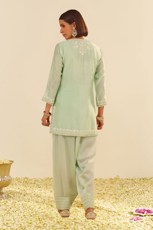 View full detailsHaniya - Short Kurta With Salwar Color: Mint Green Fabric: Kurta - Chanderi Silk Bottom - Bamberg Satin Washcare: Dry Clean Only No. Of Pcs: 2 De...