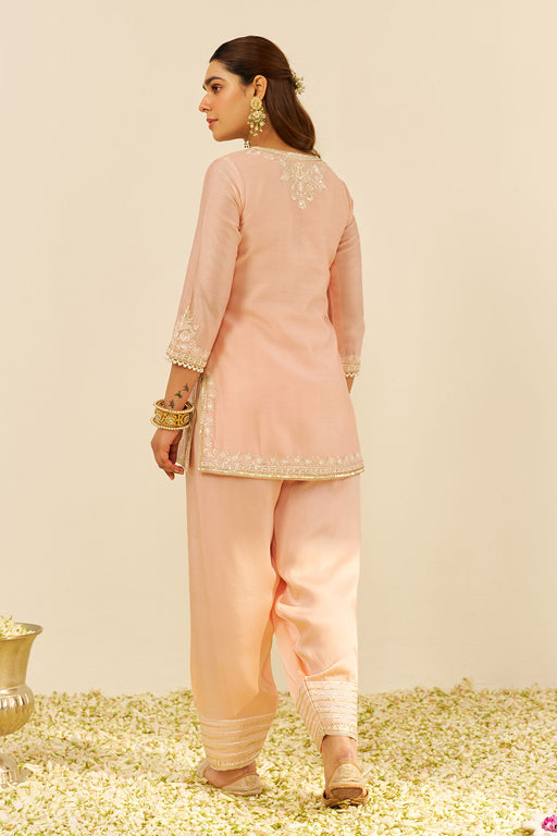 View full detailsSara - Short Kurta With Salwar Color: Blush Pink Fabric: Kurta - Chanderi Silk Bottom - Bamberg Satin Washcare: Dry Clean Only No. Of Pcs: 2 Del...