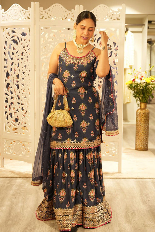 View full detailsA short length floral printed strappy kurta is paired with same printed sharara and Badla dupatta giving it a fresh and youn...