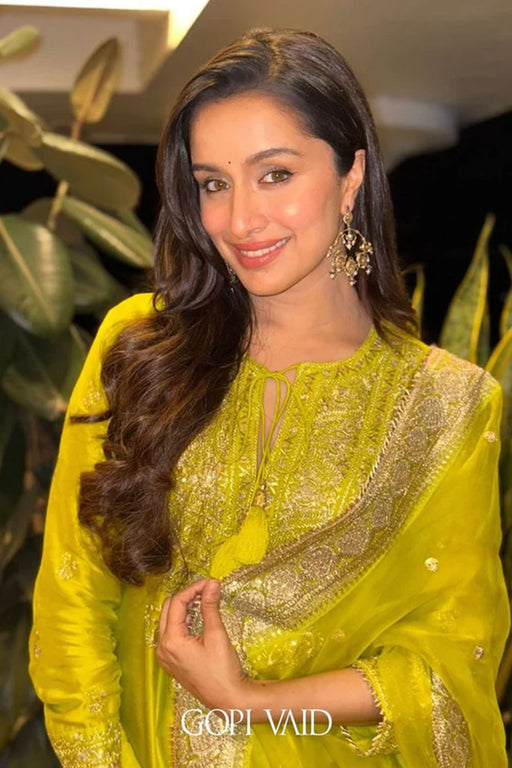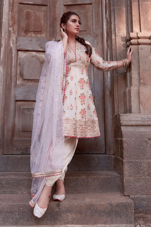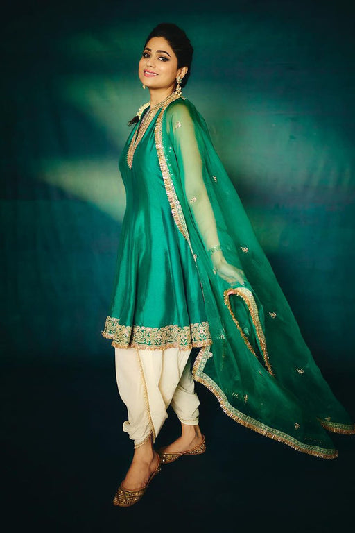 View full detailsThis pretty ensemble in floral jaal , combines gota and dori buttis with an intricate border embroidery. The short Kurta wit...