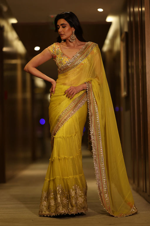 View full detailsEmbrace the allure of contemporary elegance with our Yellow Tiered Gathered Saree. This stunning saree features tiered layer...