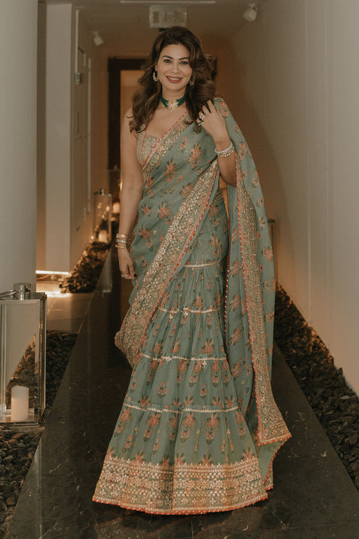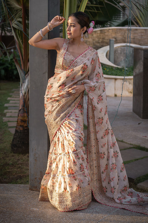 View full detailsA delicate, floral jaal, layered frill saree with flounce ,flow and intricate embroidered border is a easy wrap, The classic...