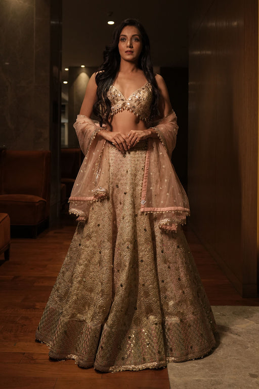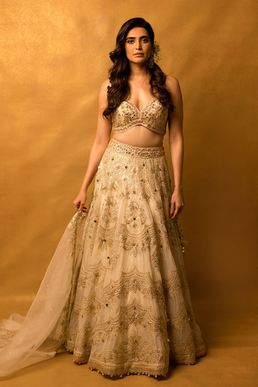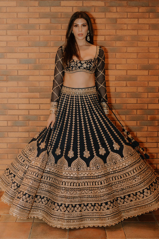 View full detailsA navy blue embroidered lehenga exudes elegance and sophistication, featuring intricate gold threadwork that creates a mesme...